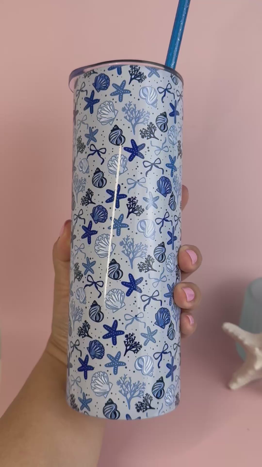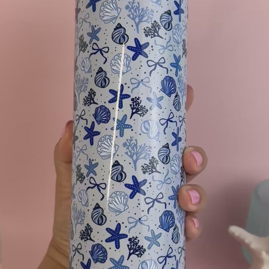 Bring cool ocean vibes wherever you go with this 20 oz insulated tumbler featuring deep blue seashells, coral, and dainty bows on a soft blue background.